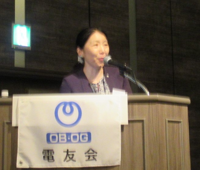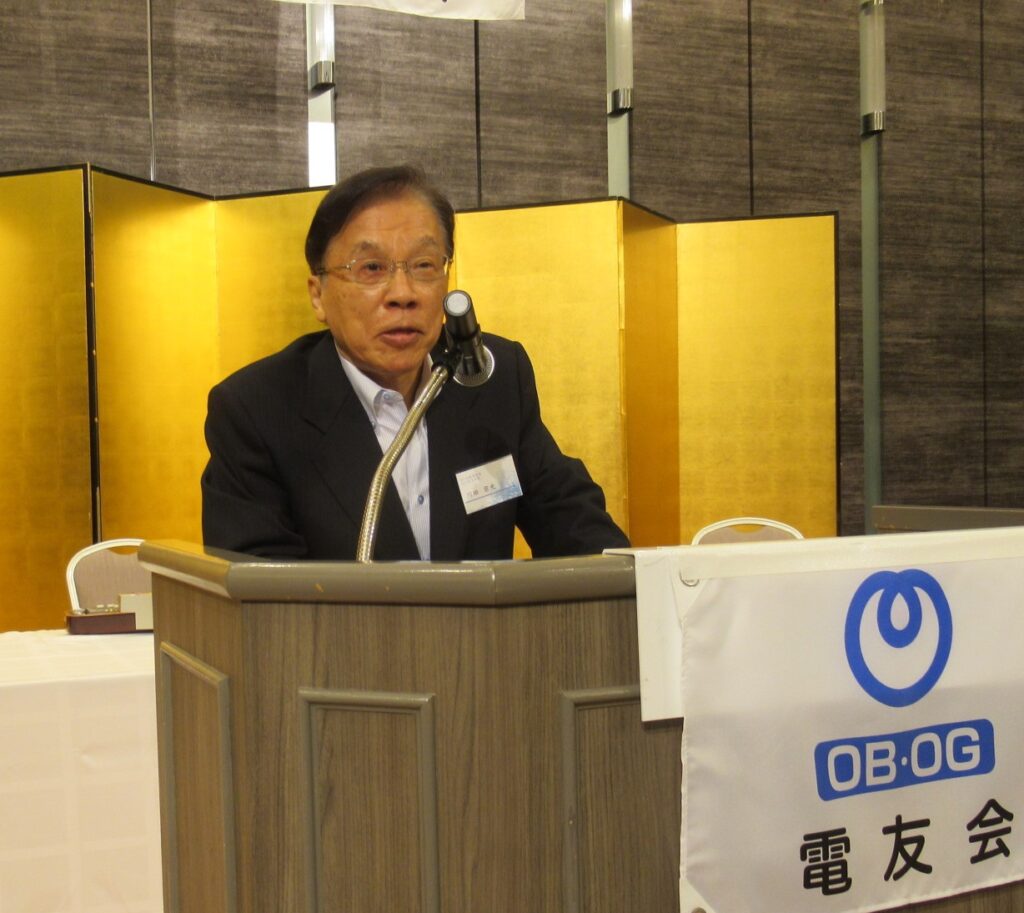 講演会に引き続き、懇親会を開催しました。懇親会を祝い大正琴サークル「ラポート琴和会」の皆さんが井上陽水さんの「夢の中へ」など3曲を披露。オープニングにふさわしく会場は華やかな空気に包まれました。次に北陸電友会会長賞として、姉﨑幸雄さんと正田武さんに川守会長から表彰状が授与されました。(左から正田さん、川守会長、姉﨑さん)