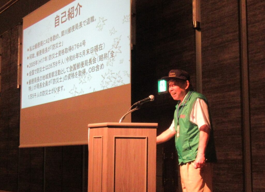 講演会第1部は、石川県防災士会理事長 福谷正信様が講演され、地震、水害など緊急事態を想定した地域での継続的な訓練や災害弱者をマッピングすることなどに日頃から目配りし、実践力を保つことの大切さをお話しされていました。