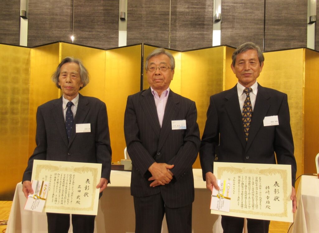 表彰は左から、正田 武さん、川守会長、姉﨑幸雄さん