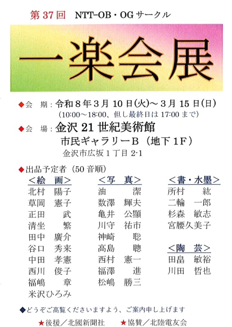 【ご案内】第37回NTT-OB・OGサークル一楽会展を開催します~陽春の金沢でアートを楽しみましょう!~ 北陸・石川県支部 2026.02.26 【ご案内】第37回NTT-OB・OGサークル一楽会展を開催します 期日 3月10日(火)~3月15日(日)会場 金沢21世紀美術館 市民ギャラリーB(地下1F)出品 25名入場料無料です。 絵画、写真、書・水墨、陶芸の各ジャンルにOB・OG25名の力作が展示されます。陽春の金沢でアートを楽しみましょう!