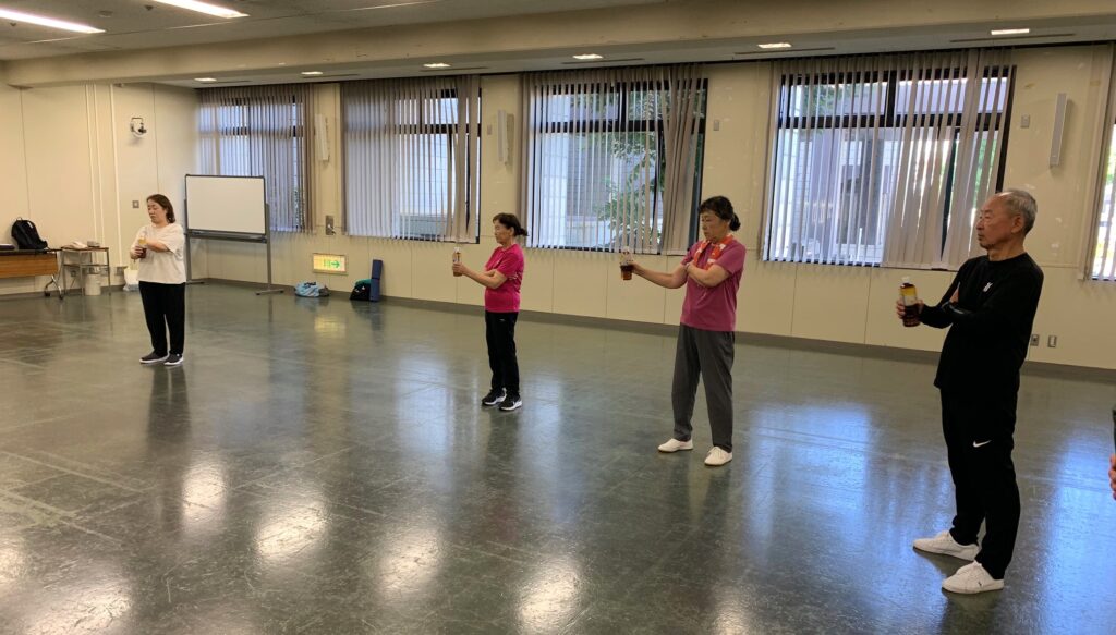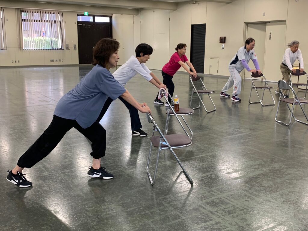 春に続き、電友会会員で日本スポーツ協会公認指導者の資格を持つ谷島助男さんにお願いした今回は、インナーマッスルを鍛えることに主眼が置かれました。インナーマッスルは、体の深層部にある筋肉の総称で、姿勢の維持・バランスや関節の安定性を高める重要な役割を担っています。参加した皆さんは、ペットボトルを持って肩や胸を鍛えたり、椅子を使ってのストレッチなど1時間30分に渡り多くのメニューを楽しくこなしていました。