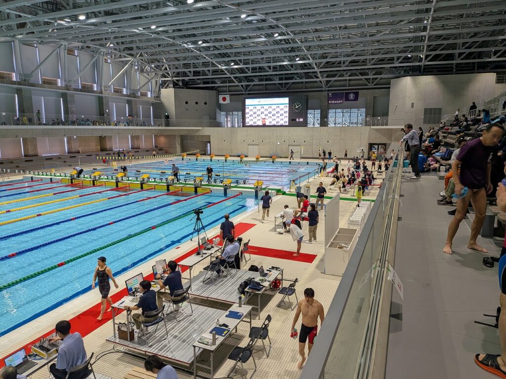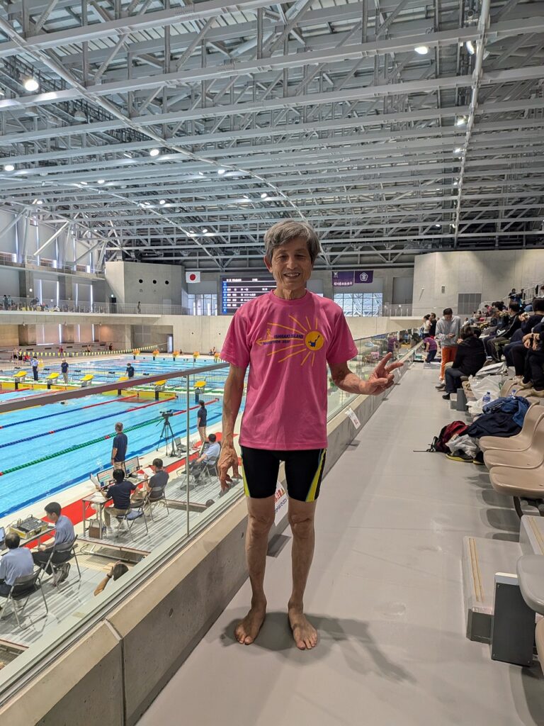 恒例の大会で、綺麗で泳ぎやすいと評判の温水プール、石川県内外の18歳から90代の383名が参加しました。17種目を5歳刻みの年代別でタイムを競うもので、姉﨑さんは、100m個人メドレー(バタフライ、背泳ぎ、平泳ぎ、クロール)で75歳から80歳の年代枠で参加し、優勝しました。日頃からスポーツジムで泳いでいるのですが、前回からタイムが落ちたと言いながらも元気に出場できたことを喜んでいました。