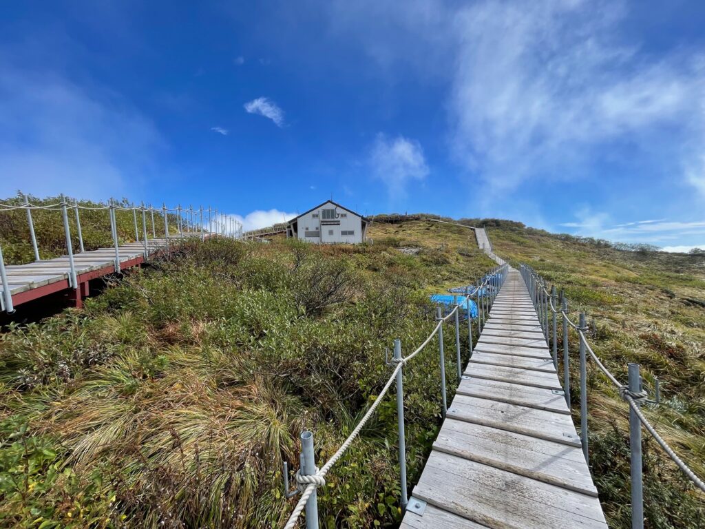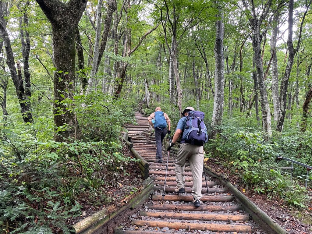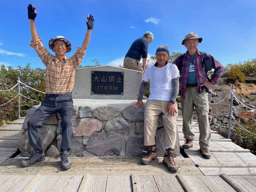 大山登山道は階段と木道が整備された全長2.6km,登山口から山頂までずーっと上りでキツイ山でした。上り3時間,下り2時間半。天気予報通り曇りで中腹から山頂はガスの中、ところが山頂間近で急にガスが取れ青空の中で山頂へ到着することが出来ました。【大塚敏郎さん記】
