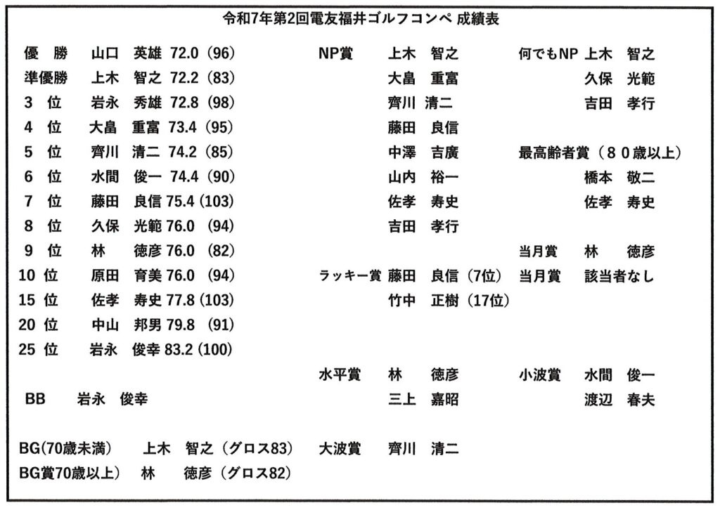 電友会福井県支部ゴルフクラブのメンバーは70名になり、今回は特にいつもより参加者が少なかったですが、次回は多くの参加者をお願いします。【佐孝壽史さん記】