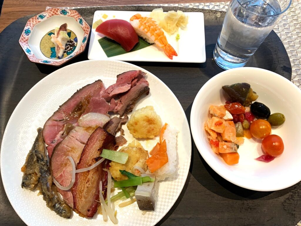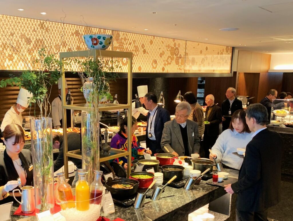 1月22日(木)、「新春おしゃべり&ホテルランチ」会を近江町市場そばのホテル山楽金沢1階「きざはし」にて開催しました。この日の朝は20cmの積雪ながら会員40名が集まり、焼きたてのローストビーフや手毬寿司、豪華なスィーツなど、ライブキッチンによるバイキング形式で食材が提供され、各自が思いおもいに盛り付け何度もおかわりし、旧友たちと心行くまでおしゃべりを楽しんでいました。