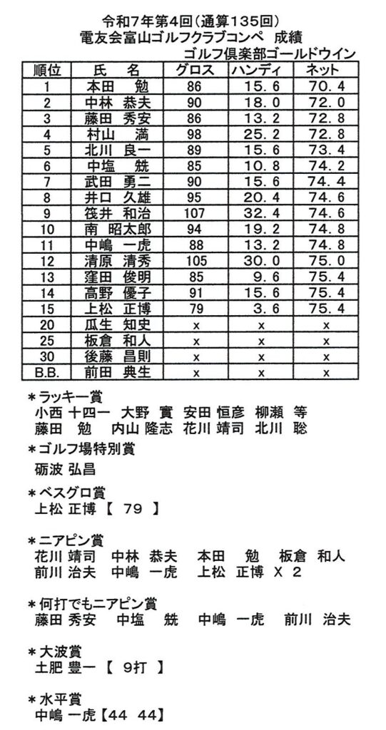 電友会富山ゴルフクラブコンペ開催(令和7年度第4回・通算135回)