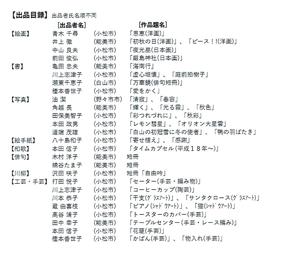 私達の作品をご覧ください!NTT小松能美OB・OGとその家族の作品展を開催(11月21-23日)
