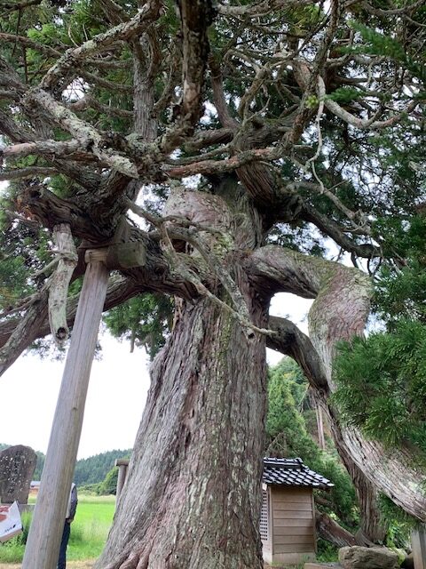 一行は、市内に入る途中にある真言宗の古刹・高照寺の門前にある老杉「倒さスギ」に立ち寄りました。樹齢九百年、高さ12m、広さ30mを誇り、能登の一本杉とも呼ばれています。
