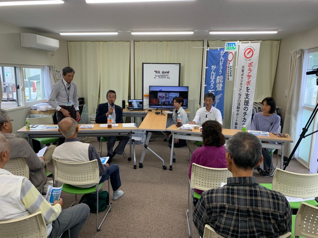 蛸島公民館長は電友会会員の増田純さん。増田さんから被災状況の説明と公民館活動、そして日頃からの心がけをお聴きし、皆さんからは現在の状況等について質疑が行われました。