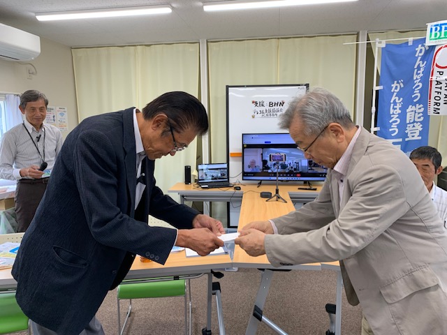 能登半島地震で最大4.9mの津波が押し寄せた能登町白丸の旧白丸郵便局の遺構を見学したあと、イカの駅つくモールに到着しました。ここでは、NTTのと地域OB会久田静児会長、亦木辰夫さん、国分友子さんとお会いすることができました。