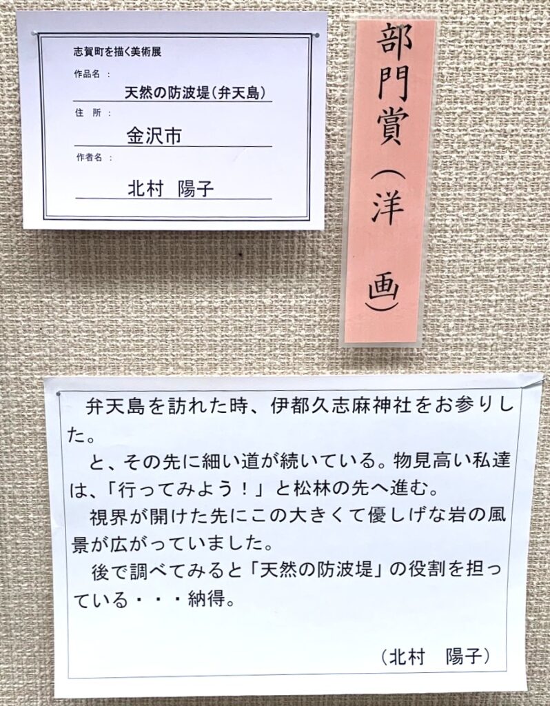 1月15日から石川県立美術館で開催されている、志賀町の自然と歴史に育まれた伝統文化を描き、絵画を通じて振興とふるさと再発見を願ってスタートした同展も第36回を迎えました。会員の北村陽子さんと田中廣介さんが抒情あふれる作品を出品し、北村さんの「天然の防波堤(弁天島)」が、洋画部門の部門賞に選定されました。(~1/18まで開催)