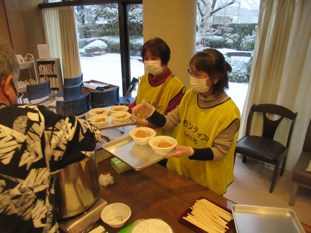 能登半島地震ボランティア 北陸・石川県支部 2024.02.052026.01.19 能登半島地震ボランティア 金沢おでんをふるまう 2月5日、会員の辨谷一枝さんが、野々市市内の能登地震2次避難先である野々市町老人福祉センター椿荘において、ボランティア仲間と費用を出し合い、輪島市から避難されている87名に金沢おでんを振舞いました。 辨谷さんは「被災された方々のために何かしたい。寒いなか温かいものをということで金沢おでんになりました」と語ってくれました。辨谷さんの活動に敬意を表します。 辨谷さん(右)